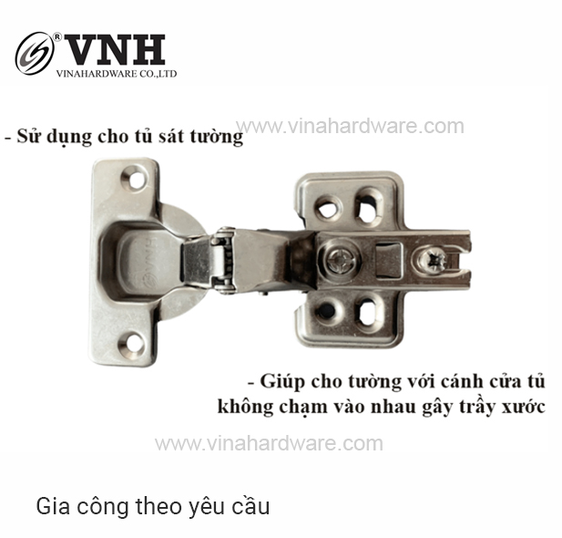 Bản lề cong vừa: Là loại bản lề có cấu tạo từ bản lề bật cong vừa và giảm chấn. Sử dụng với 2 tủ liền kề có chung 1 vách.