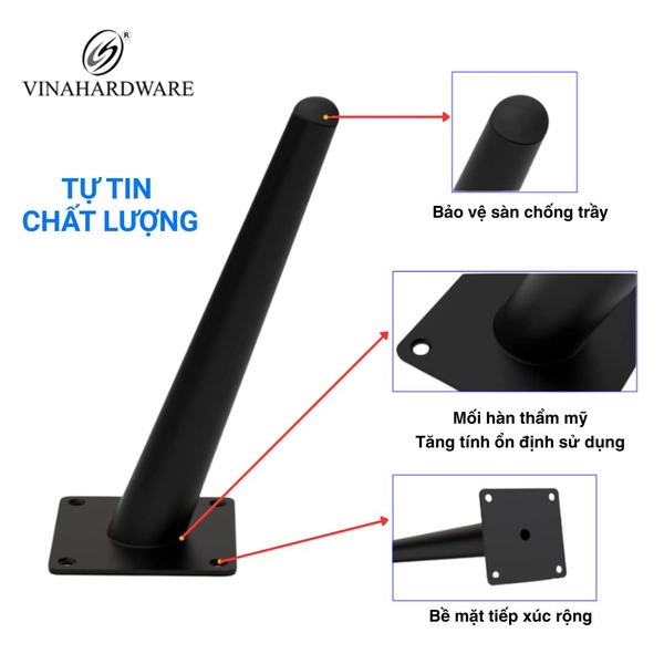 Chân côn nghiêng 2102.2.11006 được thiết kế với ống thép nghiêng và thuôn dần về đáy, phủ sơn tĩnh điện đen sang trọng. Sản phẩm có nhiều chiều cao từ 100mm đến 720mm, phù hợp cho các ứng dụng nội thất như ghế sofa, bàn làm việc, bàn trà, tủ kệ.