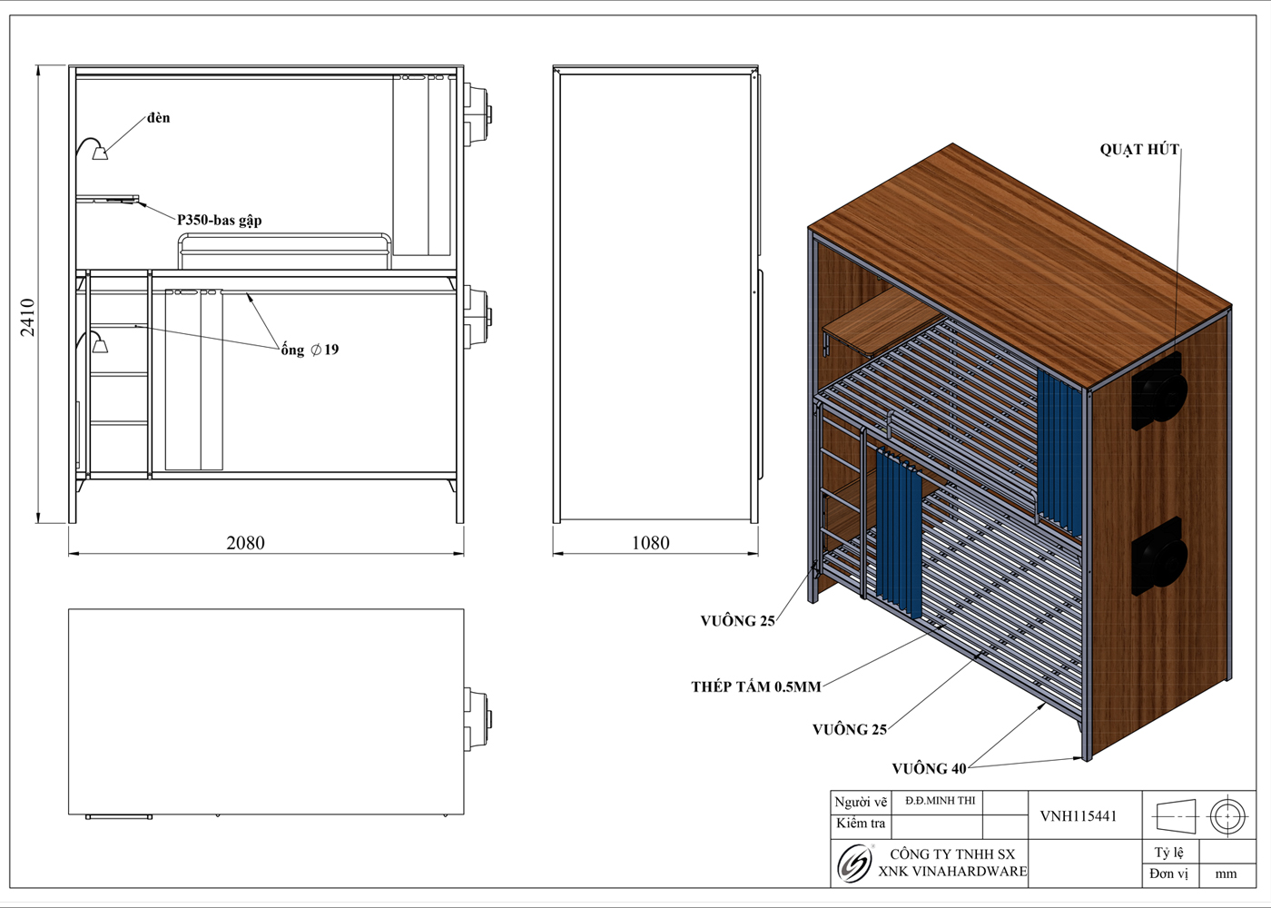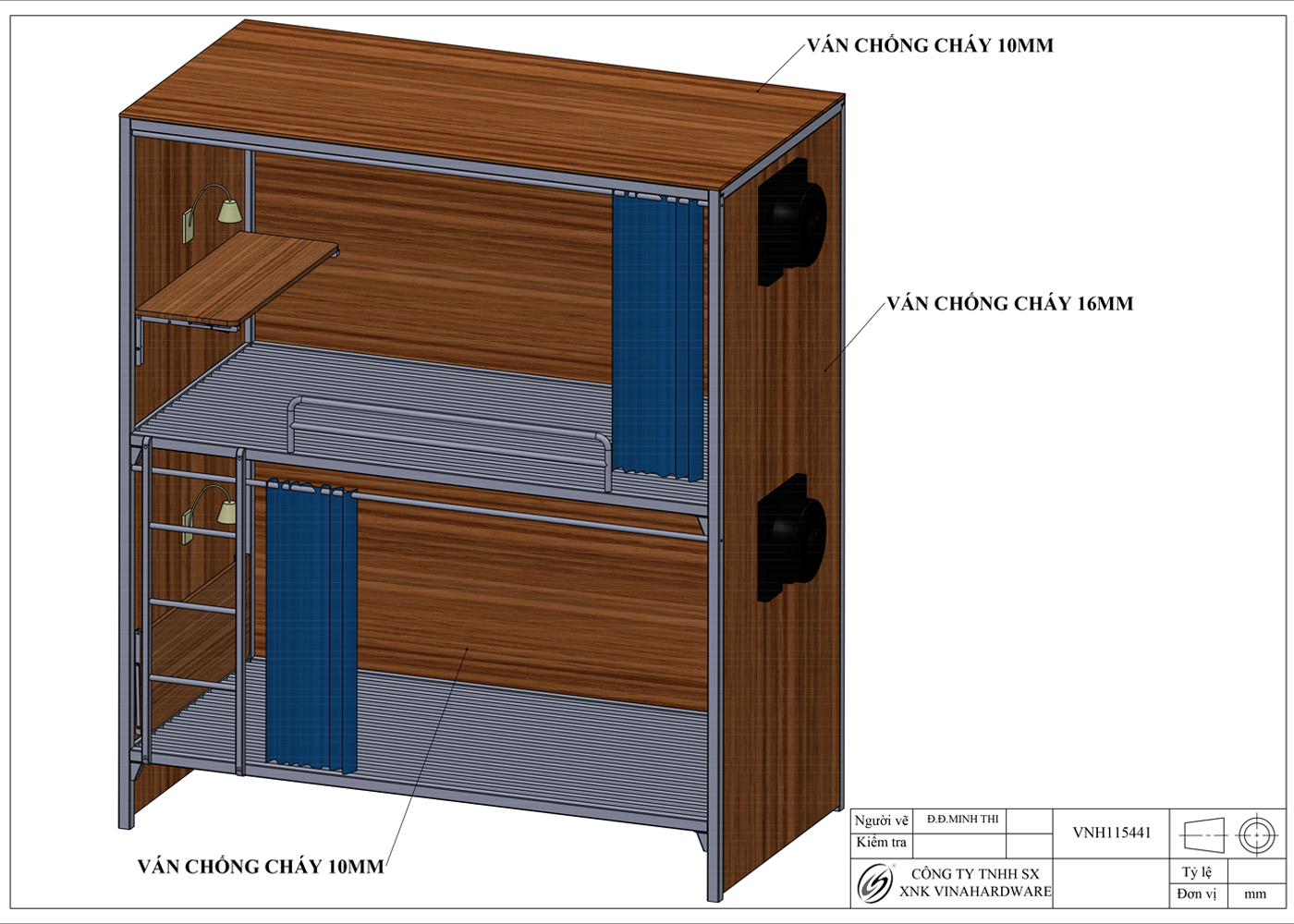 Giường tầng chống cháy được thiết kế trên vật liệu chống cháy Vinahardware dành cho ký túc xá sinh viên, nhà trọ, nhà lưu trú.