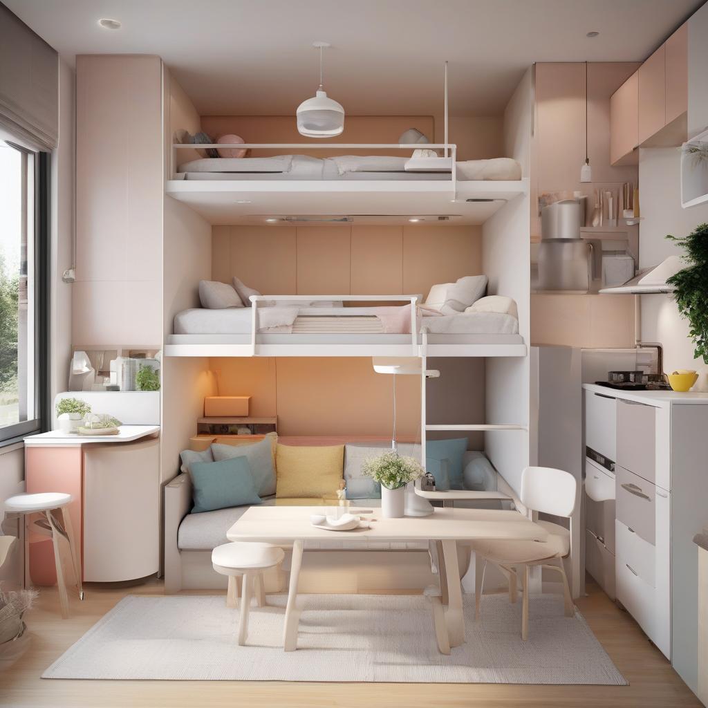 Nội thất tích hợp thông minh: Mỗi sản phẩm đều được thiết kế theo dạng module, dễ dàng thay đổi chức năng. Ví dụ, giường gấp có thể biến thành sofa, tủ quần áo có thể tích hợp với bàn làm việc.