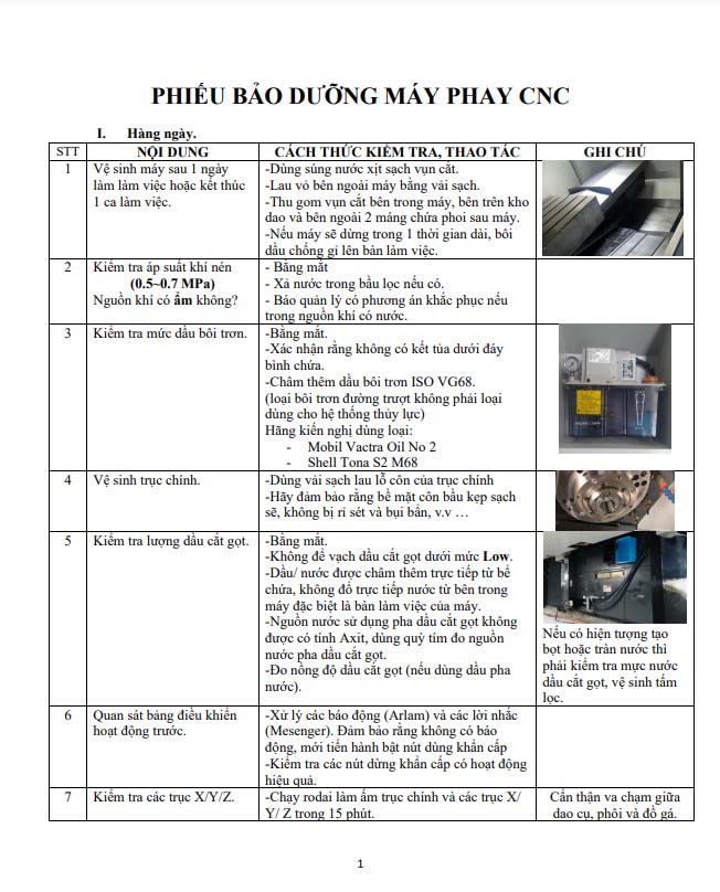II. QUY TRÌNH BẢO DƯỠNG MÁY PHAY CNC