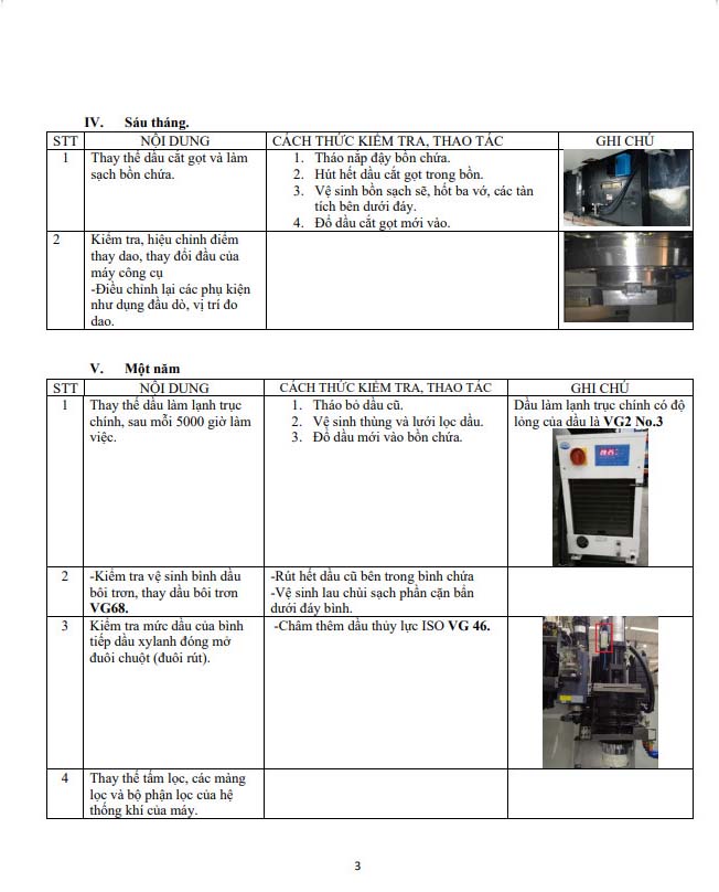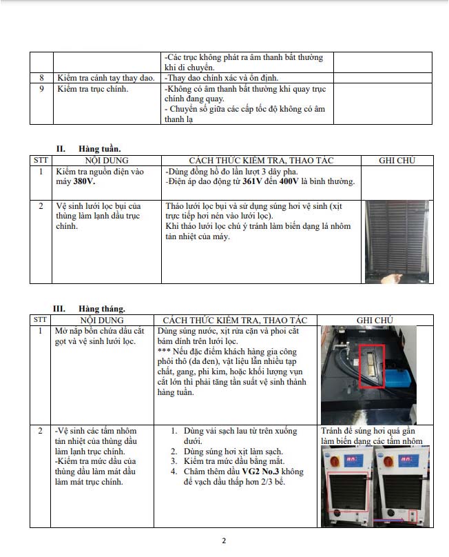 * Cần tuân thủ những công việc cần làm hàng ngày/ hàng tuần / hàng tháng/ 6 tháng/ 1 năm để đảm bảo máy móc luôn được vận hành ổn định.