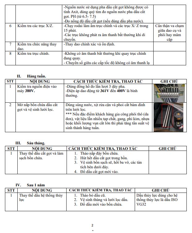 * Cần tuân thủ những công việc cần làm hàng ngày/ hàng tuần / 6 tháng/ 1 năm để đảm bảo máy móc luôn được vận hành ổn định.