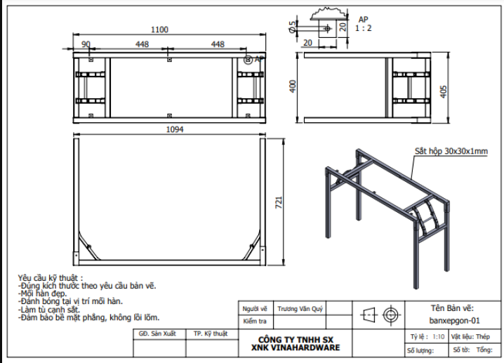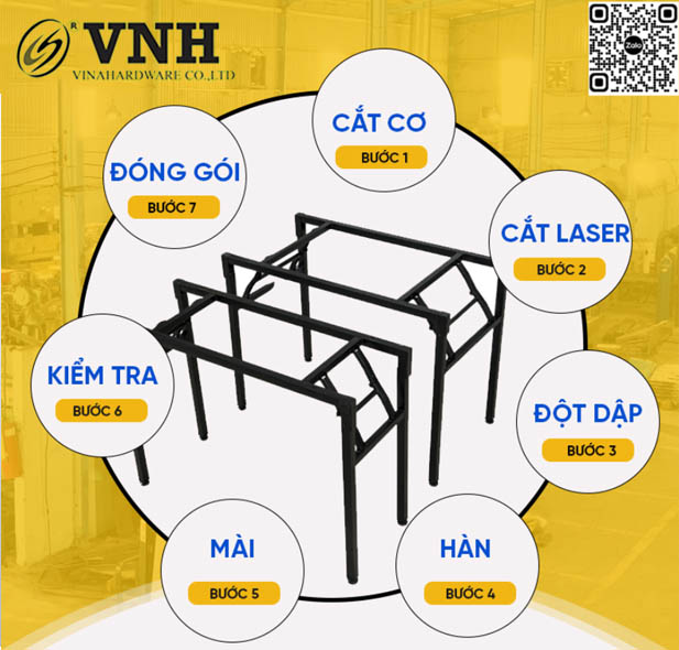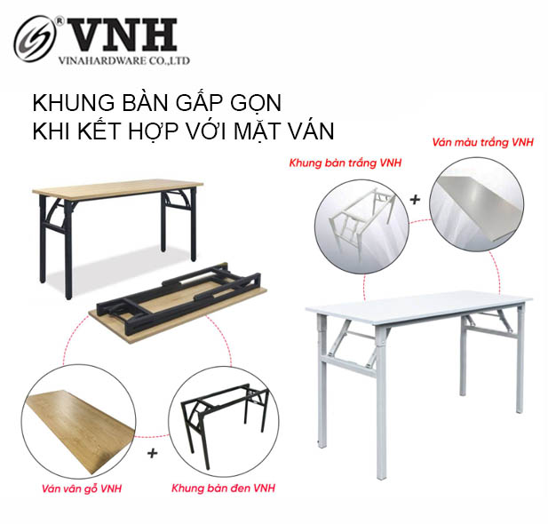 Khung bàn xếp gọn được sản xuất ngay tại Xưởng Vinahardware, Vinahardware có đầy đủ máy móc, trang thiết bị, nhằm sản xuất theo đúng yêu cầu của khách hàng. Tùy theo yêu cầu khách hàng, Vinahardware sẽ ước lượng tỷ lệ, quy cách sản phẩm để phù hợp.