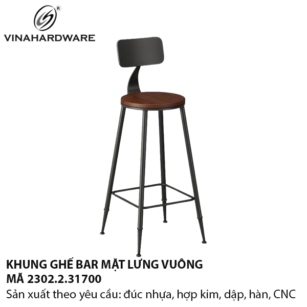 Khung ghế bar mặt lưng vuông 2302.2.31700 được thiết kế hiện đại, thanh thoát với chân côn sắt sơn tĩnh điện đen cát, tựa lưng vuông cách điệu mang lại cảm giác sang trọng và vững chắc.