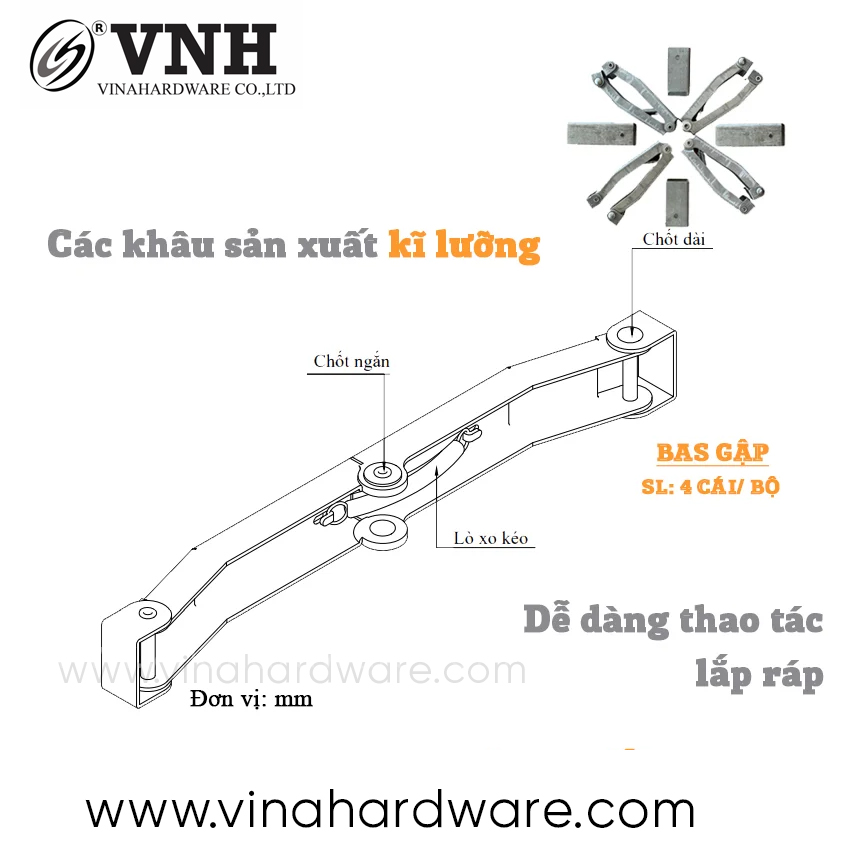 Cấu tạo: Dập nguội chính xác, liên kết bằng đinh rive, tích hợp lò xo kéo giúp đóng/mở linh hoạt