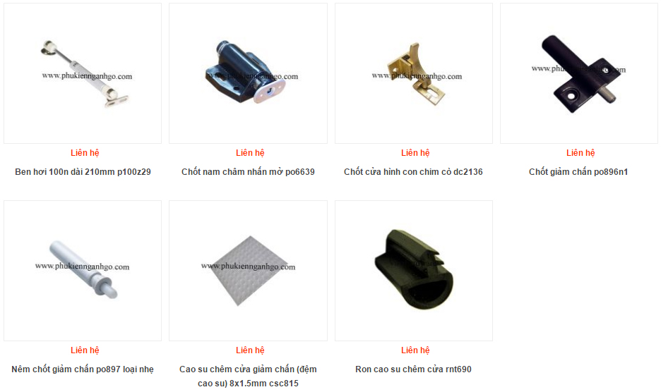 Hình 1. Các loại phụ kiện giảm chấn, đóng chậm cánh cửa tủ: dùng ben hơi loại piston thường mở, dùng loại chốt nhấn mở cũng là phương án giảm chấn, loại nêm giảm chấn lắp đặt bên ngoài, loại âm tủ, loại cao su hình tròn dán cạnh tủ chống va đập chống ồn...