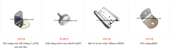 Hình 1. Các loại phụ kiện dành cho nhà vệ sinh: pát (bas) cho thanh treo quần áo loại inox không rỉ. Các loại cây chân chống cho vách ngăn nhà vệ sinh, bản lề nắp bật loại inox không rỉ cho cửa nhà vệ sinh, móc chống va đập cửa...các loại pát (bas) vuông inox, bản lề hai chiều...