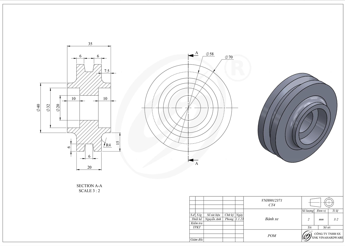 Bánh xe: Nhựa POM cao cấp, gắn bạc đạn 6201, chịu lực tốt