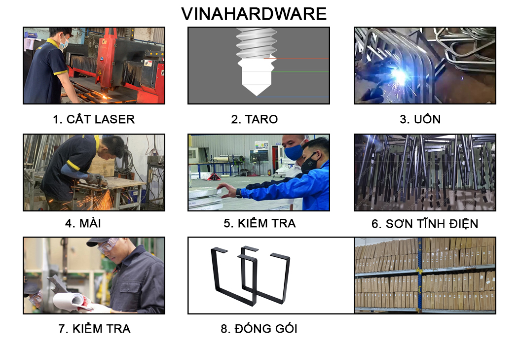 1. Cắt laser, 2. Taro, 3. Uốn, 4. Mài, 5. Kiểm tra , 6. Sơn tĩnh điện, 7. Kiểm tra, 8. Đóng gói